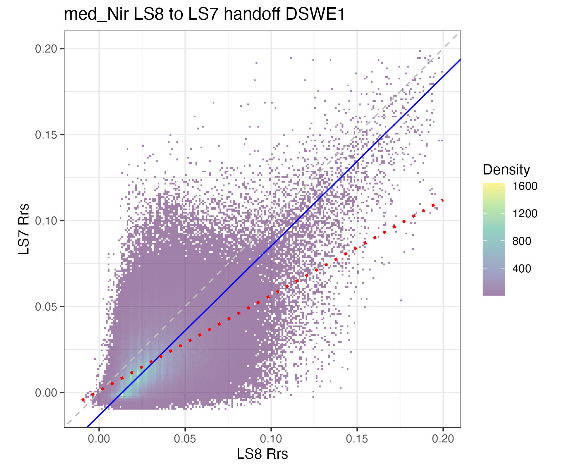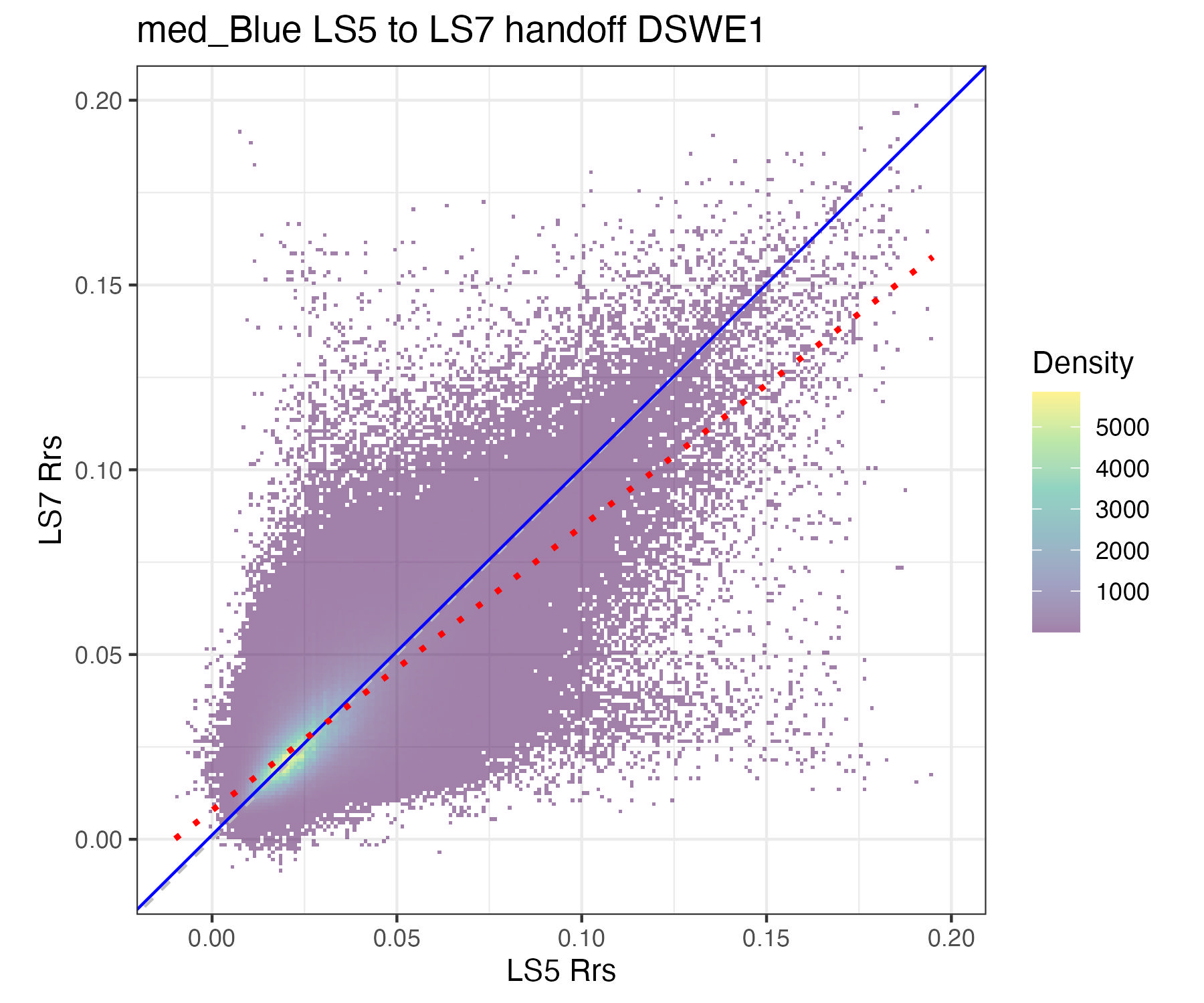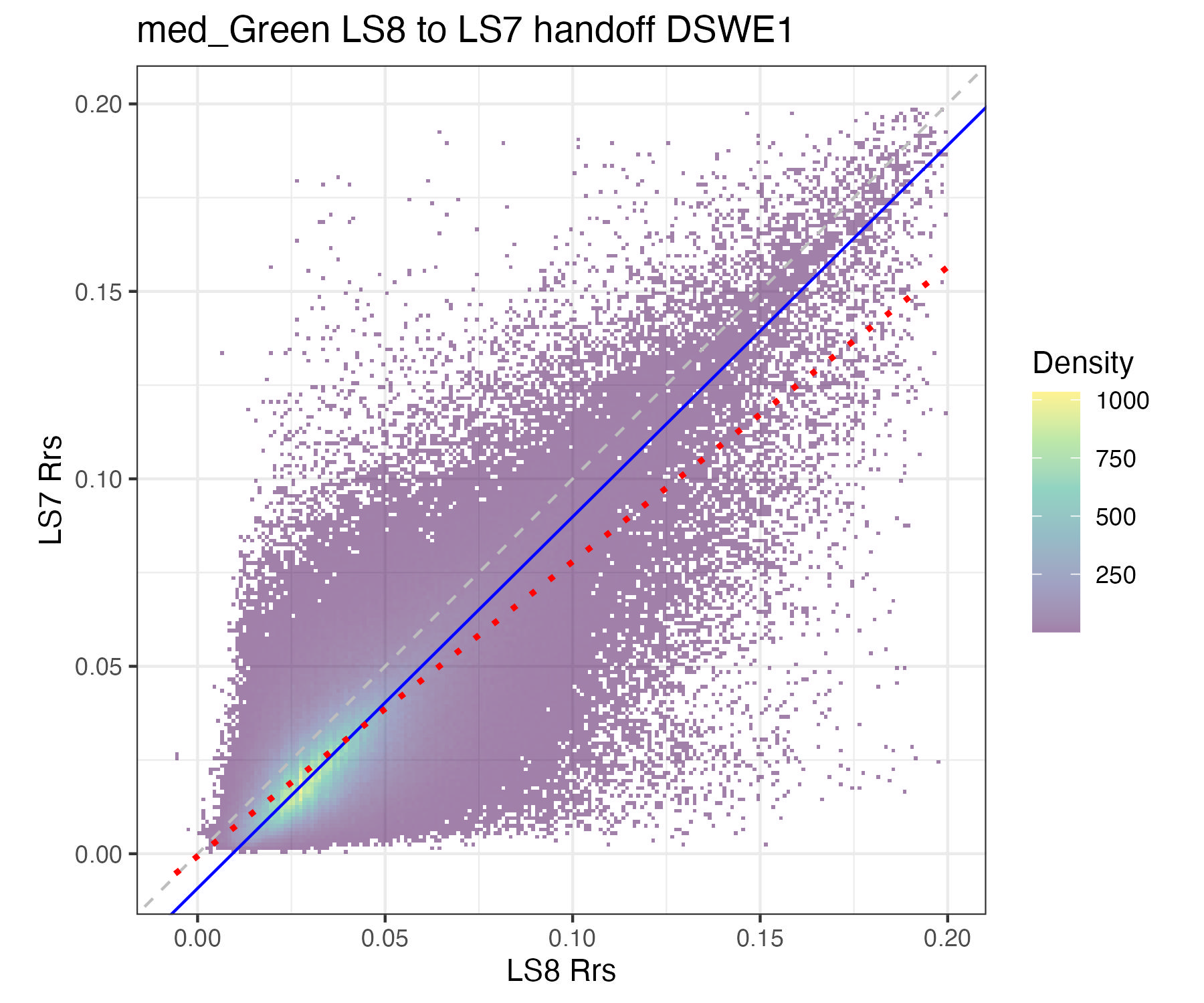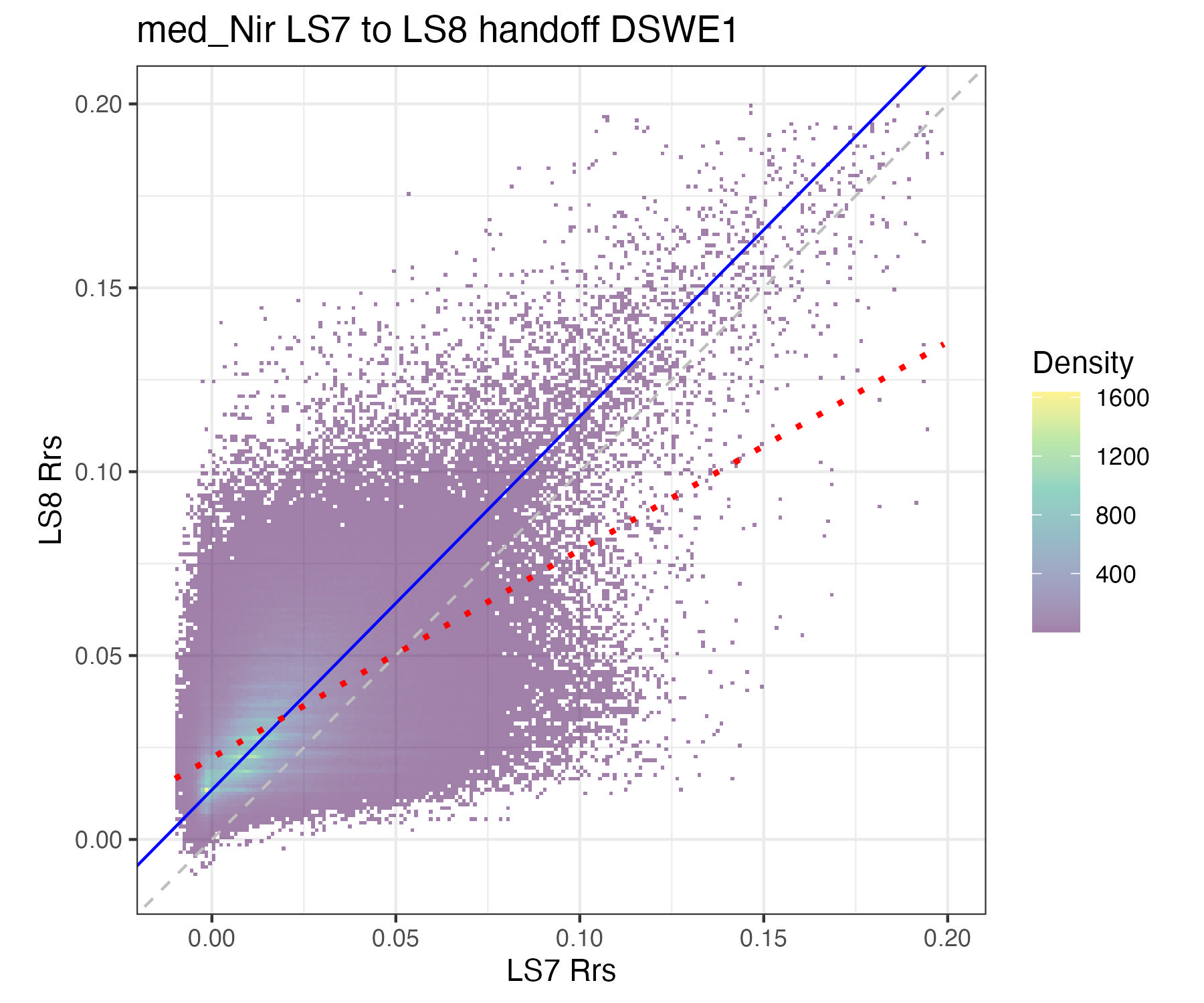 For the purposes of this document, we only present the handoff coefficients for DSWE1 (confident water) and do not investigate differences between the DSWE1 or DSWE1a coefficients, though we provide both. Users should use these handoff coefficients if using data from more than one sensor group (TM, ETM+, OLI).