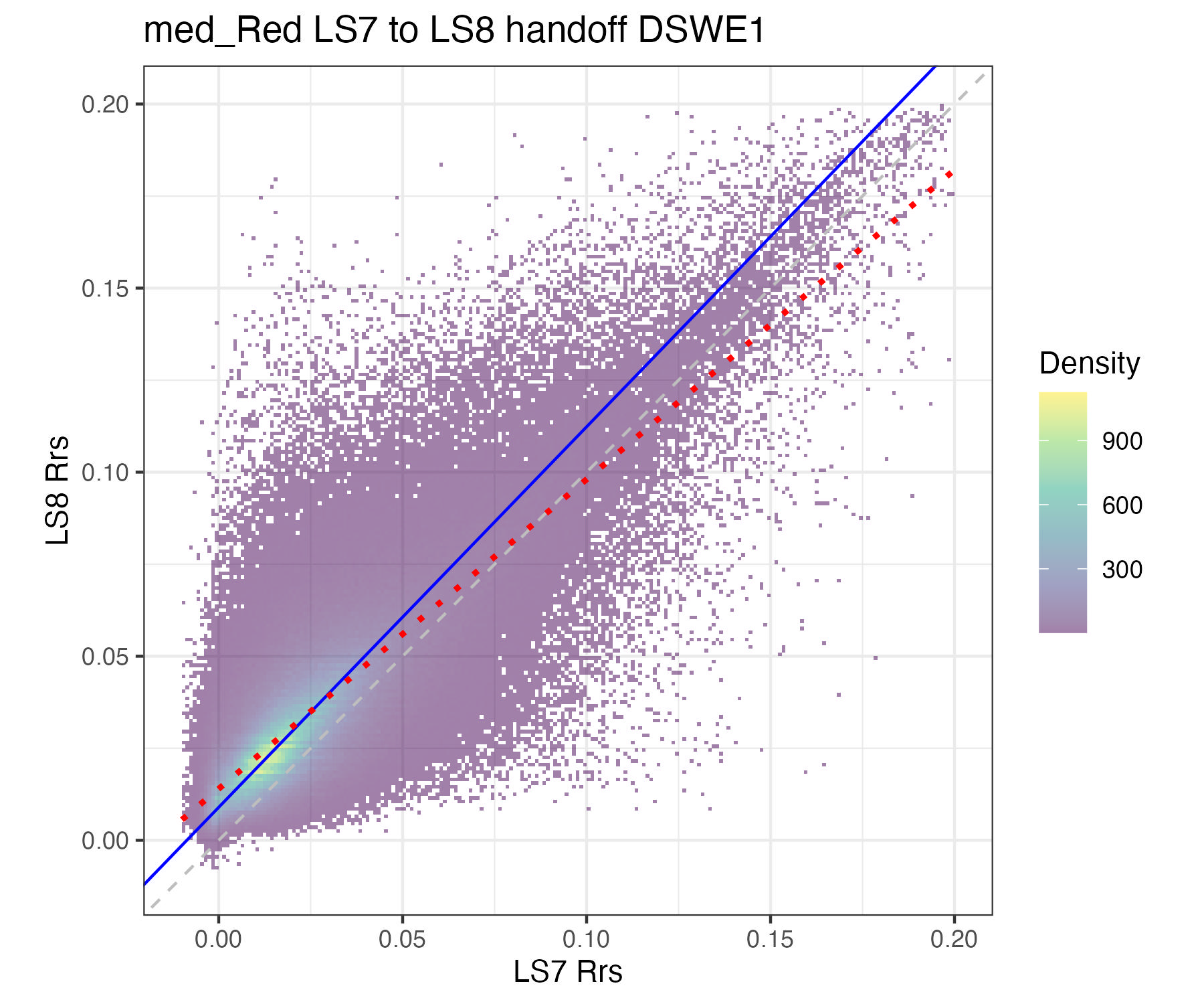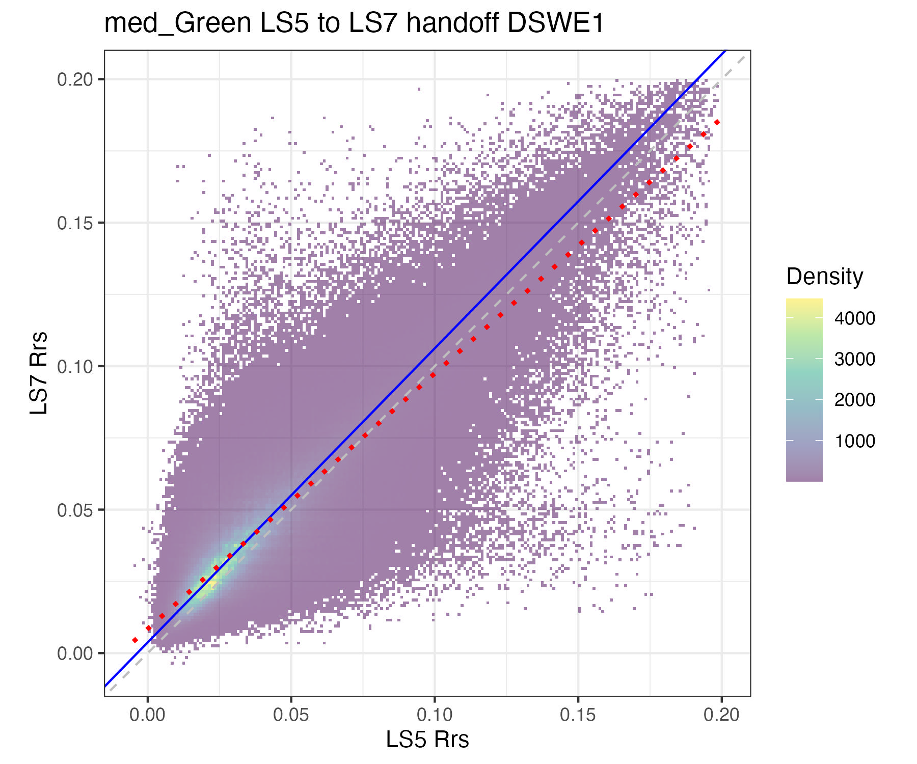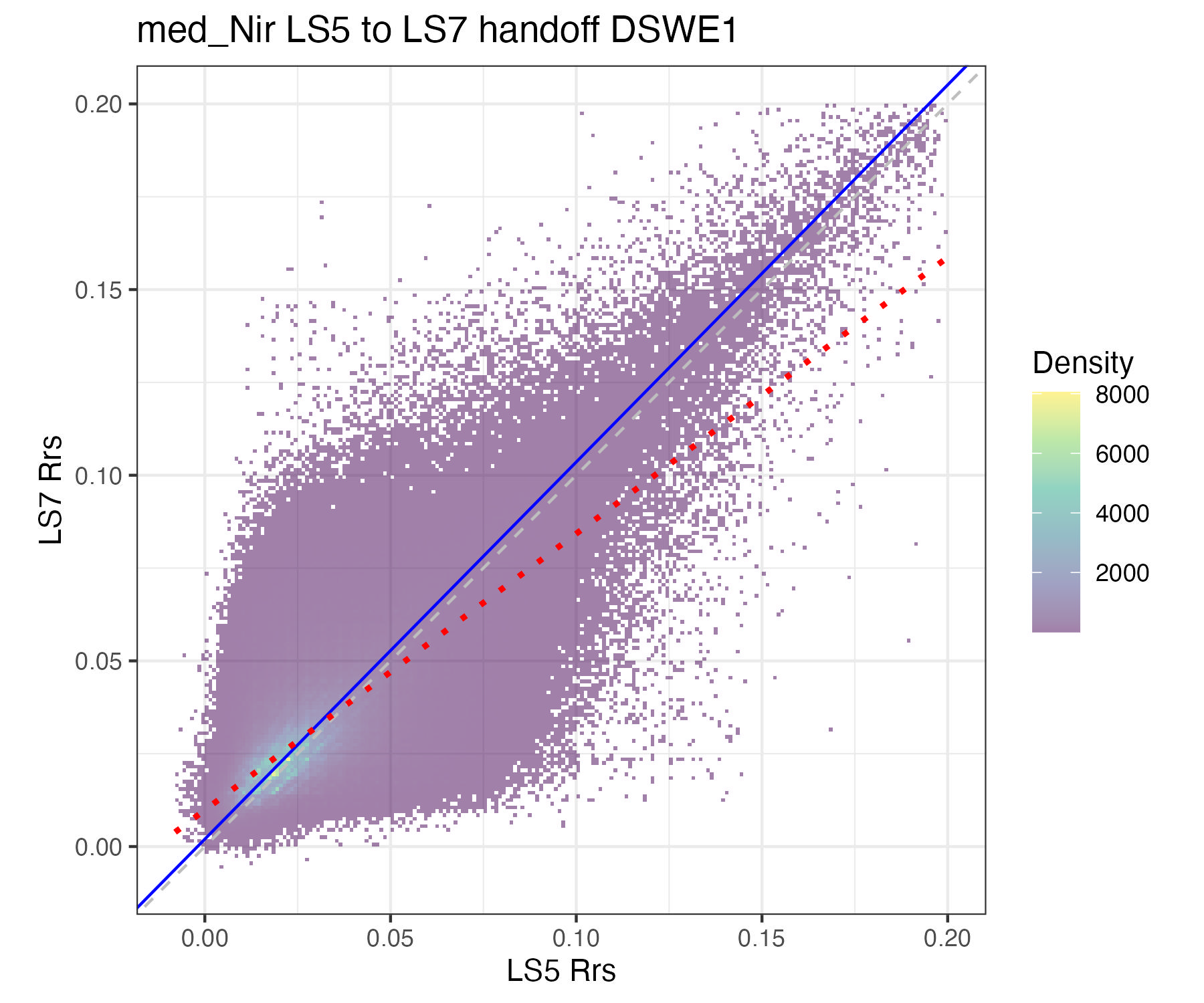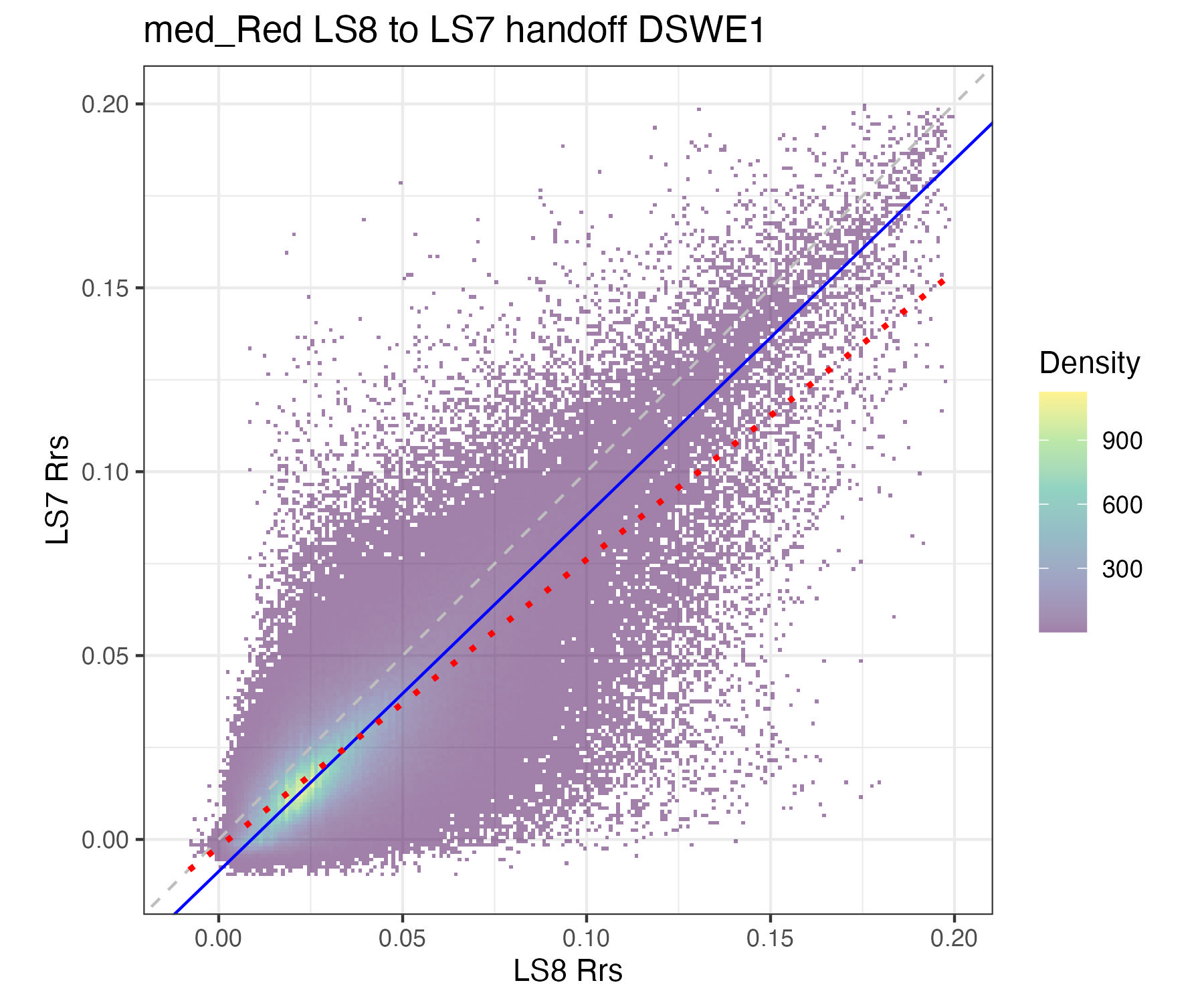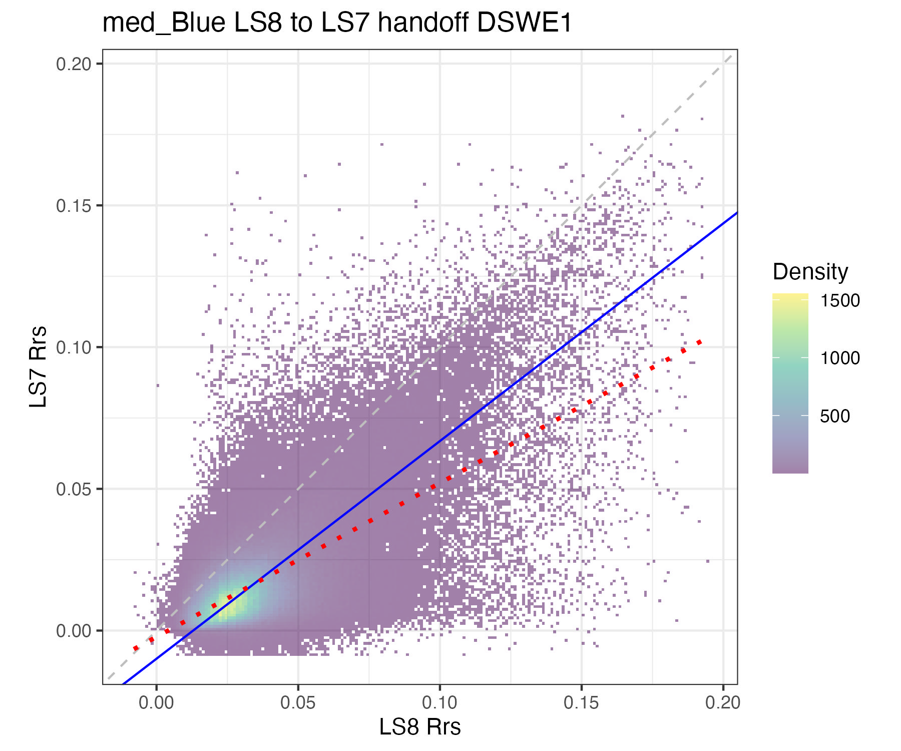 For the purposes of this document, we only present the handoff coefficients for DSWE1 (confident water) and do not investigate differences between the DSWE1 or DSWE1a coefficients, though we provide both. Users should use these handoff coefficients if using data from more than one sensor group (TM, ETM+, OLI).