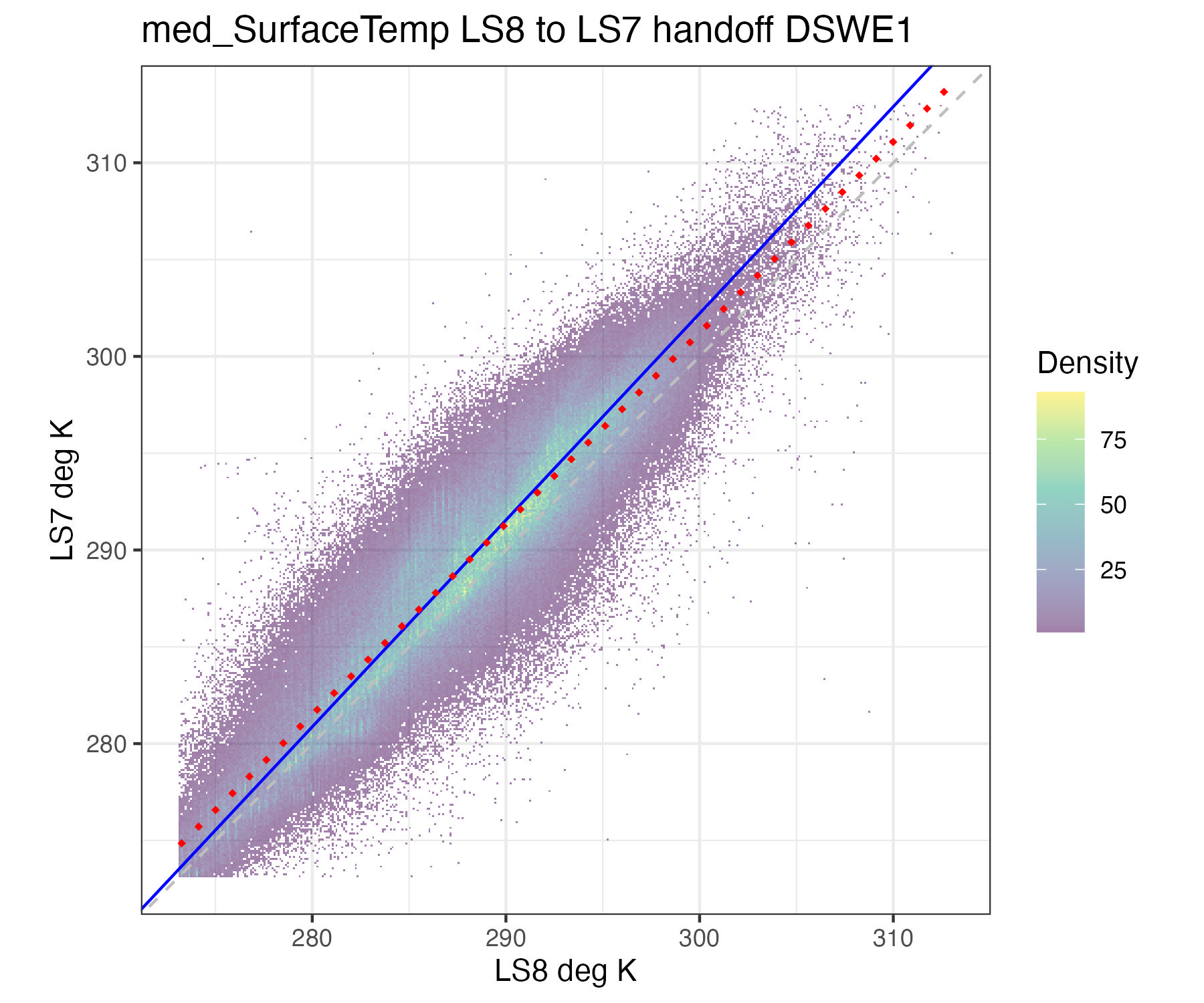 Gardner method intermission handoffs are defined by the data obtained in the overlapping period of time between two adjacent-in-time missions. These data are filtered to sites that have at least one data point per year for at least 75% of the years of overlap. The filtered data are then summarized to each mission’s 1st-99th percentile value per band, and the handoff coefficients between missions are defined by the second-order polynomial (quadratic) relationship between them. Because this method uses a second-order polynomial to define the handoff relationship, all input (x) values outside of the 1st and 99th percentile values used to define the intermission handoff should be used with extreme caution.