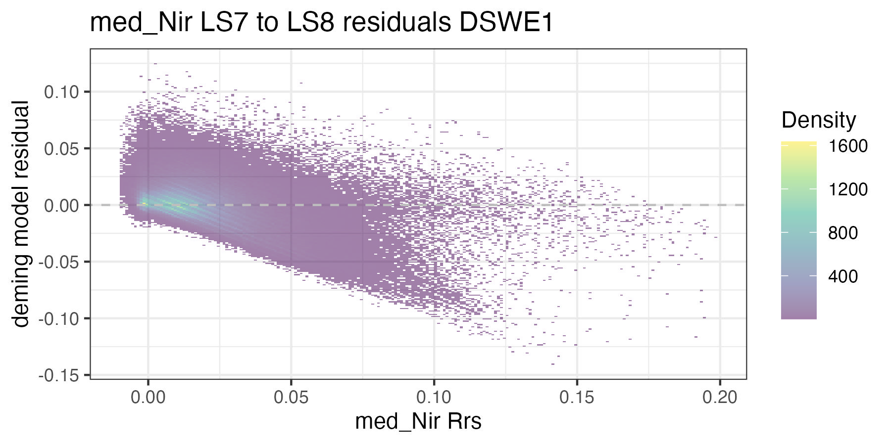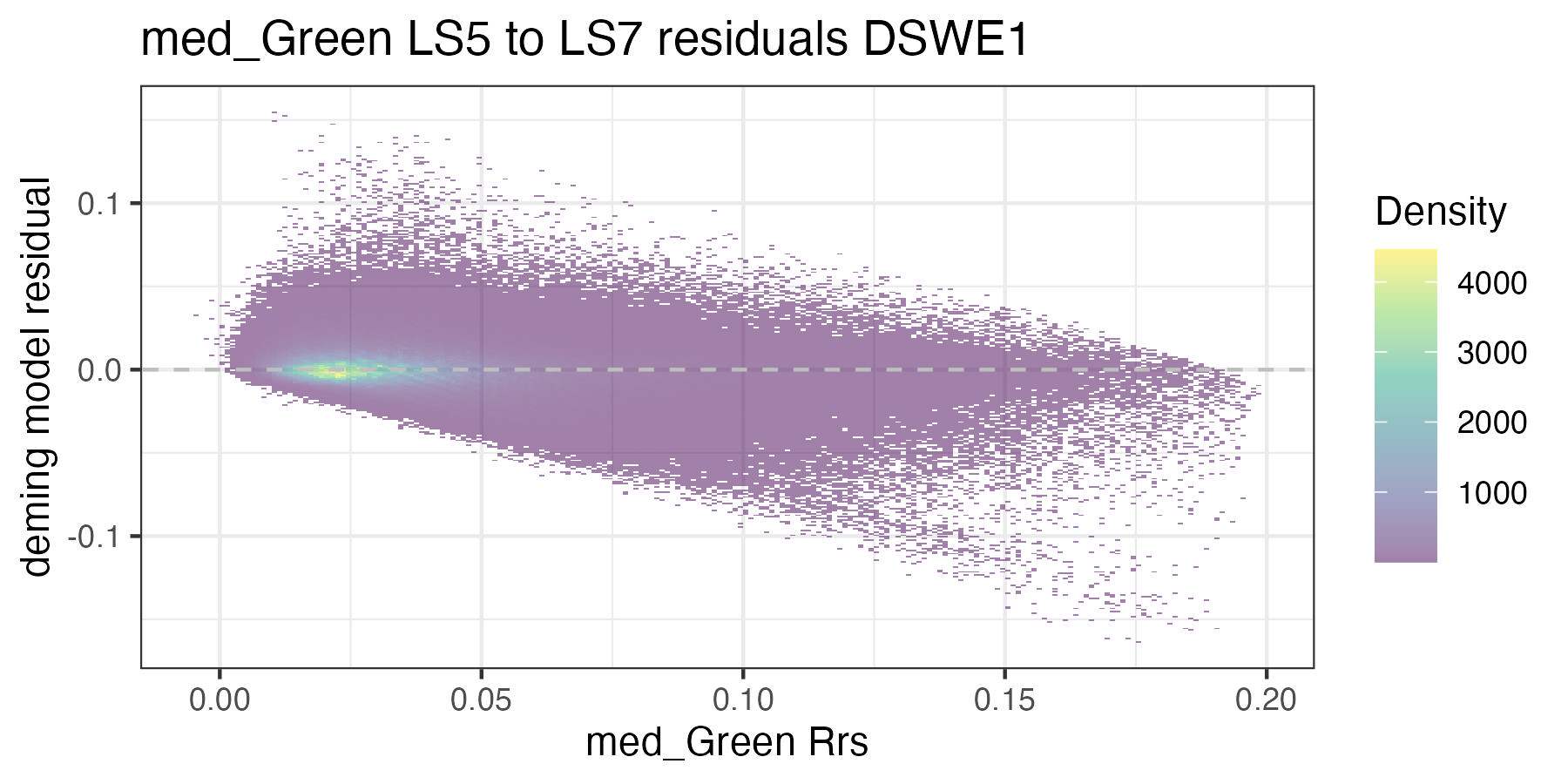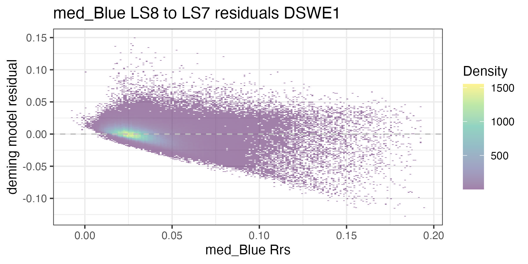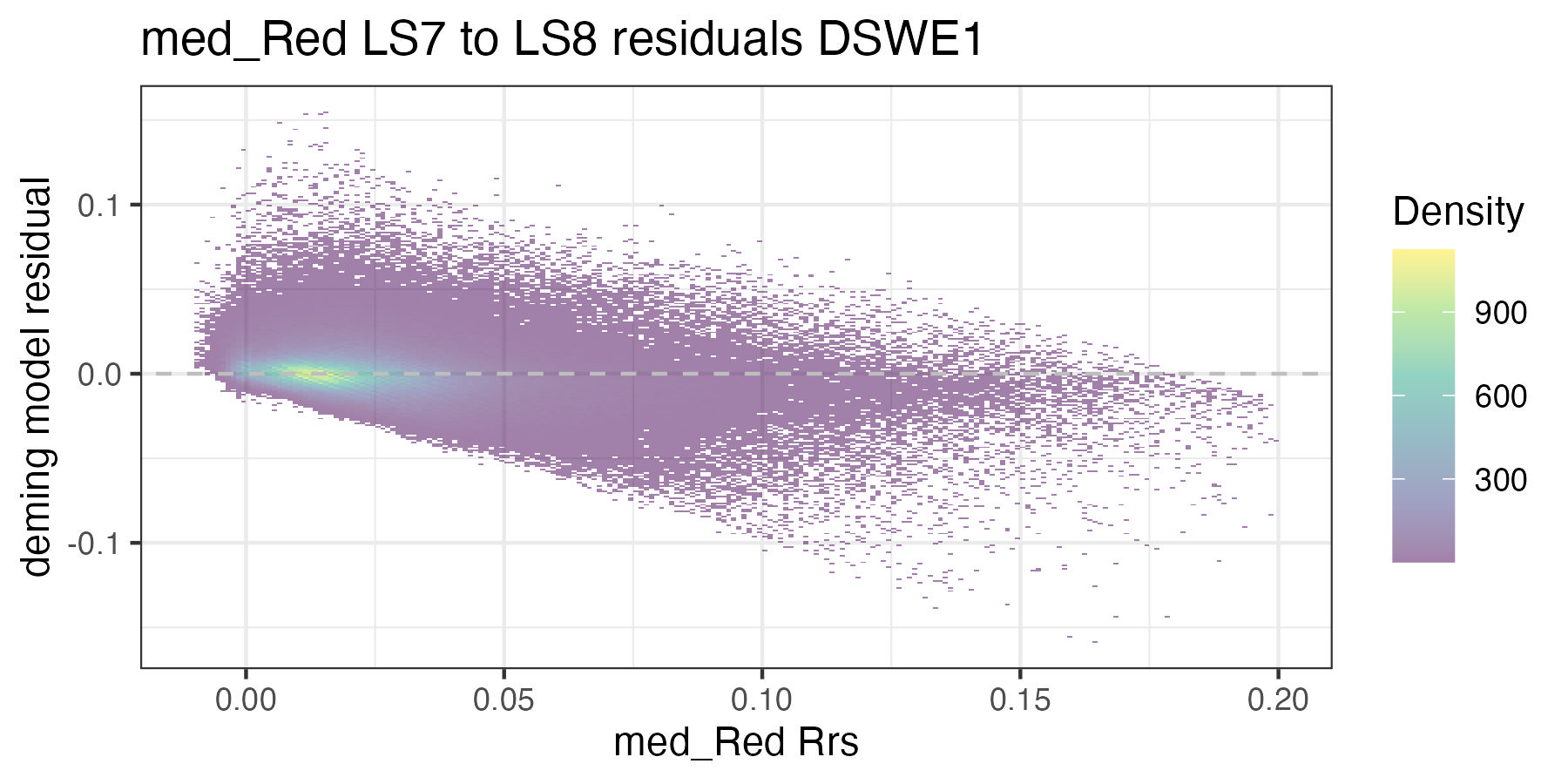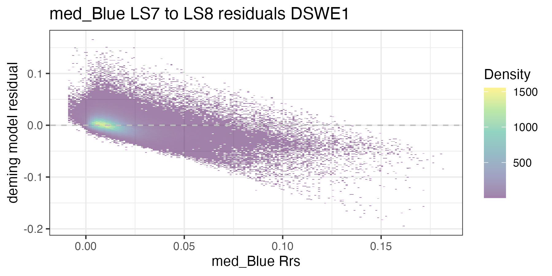 For each of the handoff figures below, the blue solid line is the Deming (MLE) regression, the red line is the OLS regression line, and the grey dashed line is the 1:1 line. Coefficients for the Deming regression are provided in Table 8.2. Color of dots represents the density of points in at a given x, y location. In the residual plots, the grey dashed line is a 0 intercept, 0 slope line visual aide.