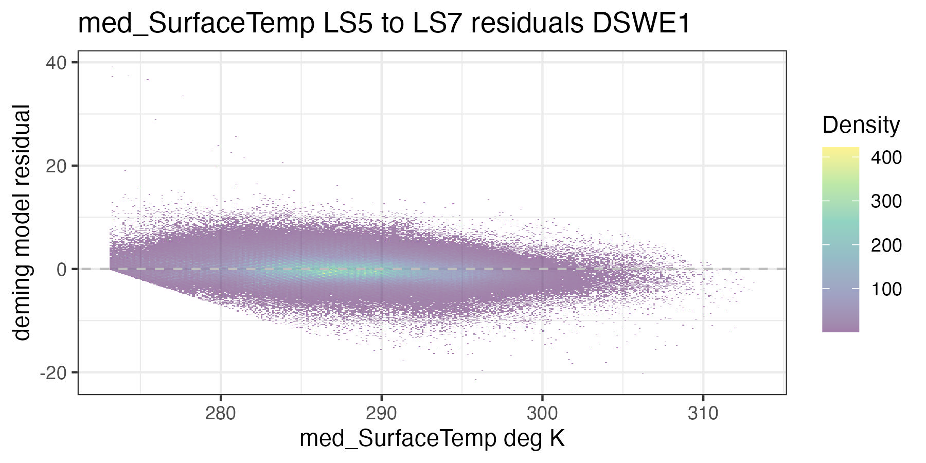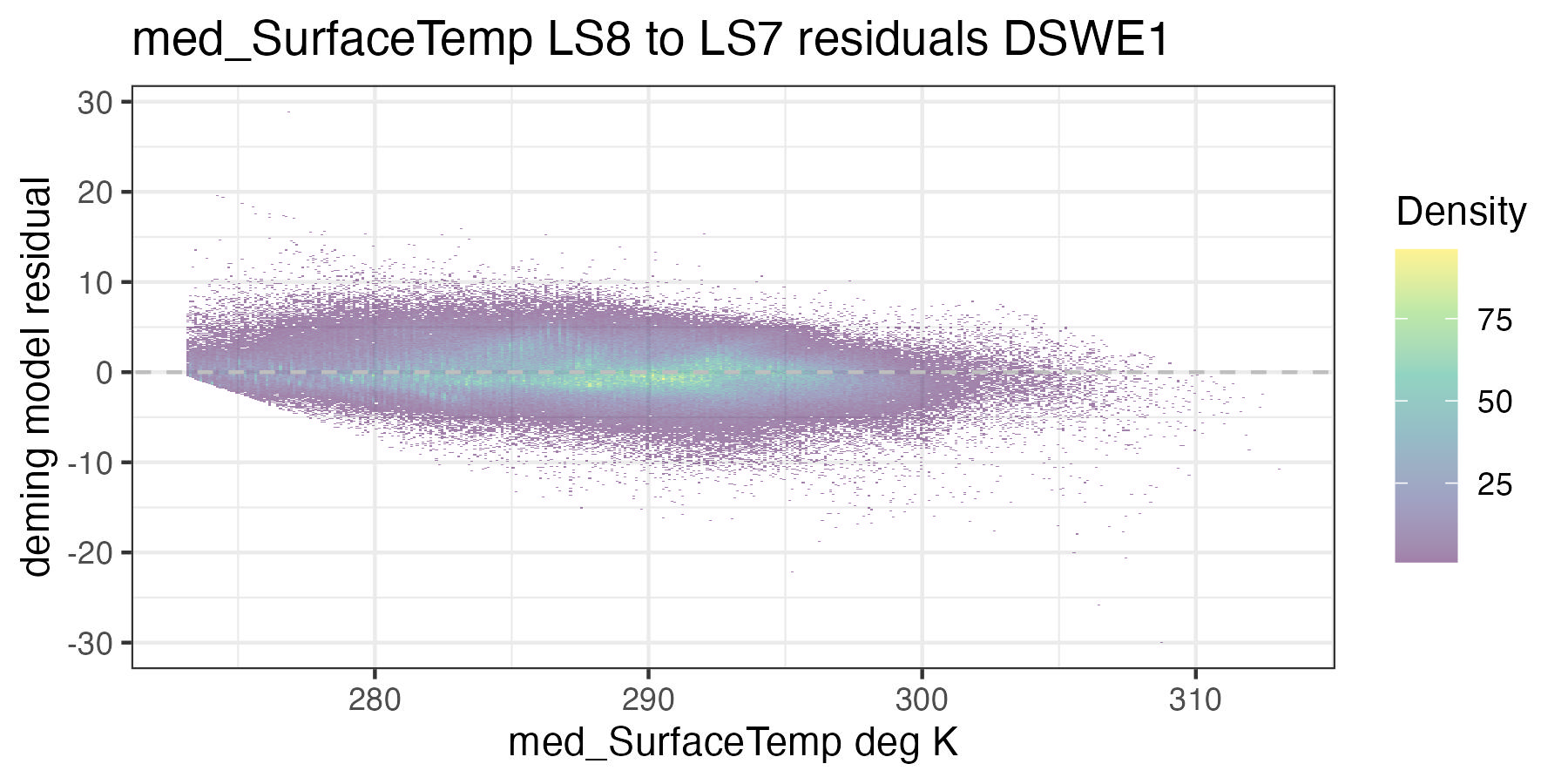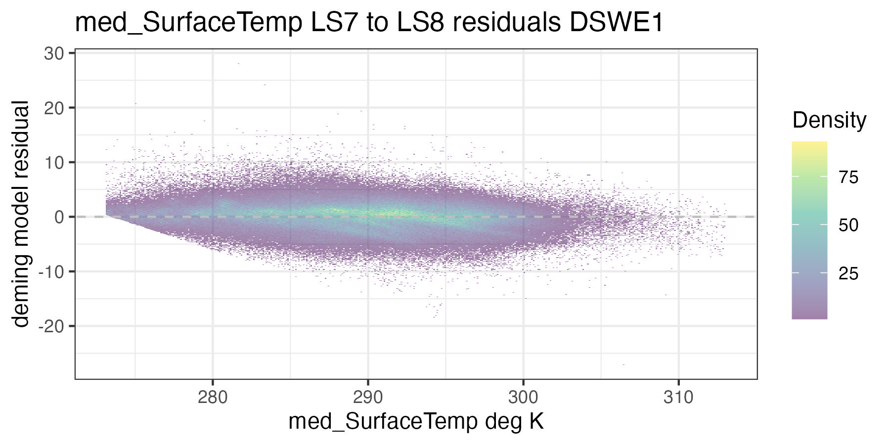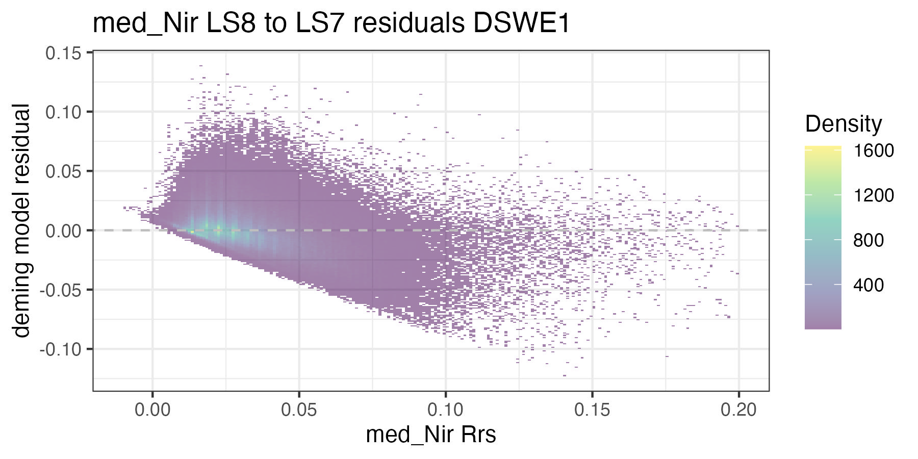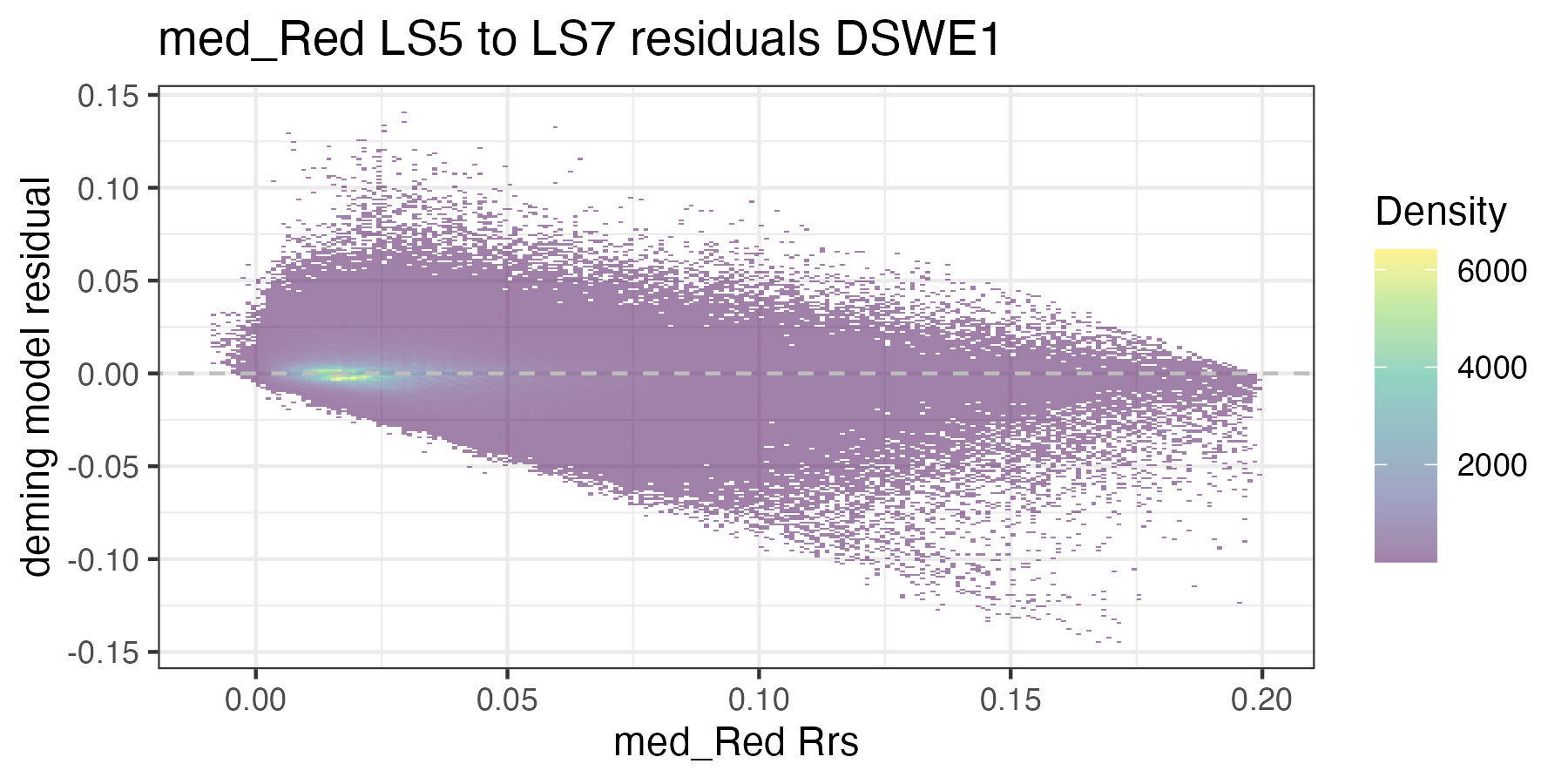For each of the handoff figures below, the blue solid line is the Deming (MLE) regression, the red line is the OLS regression line, and the grey dashed line is the 1:1 line. Coefficients for the Deming regression are provided in Table 8.2. Color of dots represents the density of points in at a given x, y location. In the residual plots, the grey dashed line is a 0 intercept, 0 slope line visual aide.